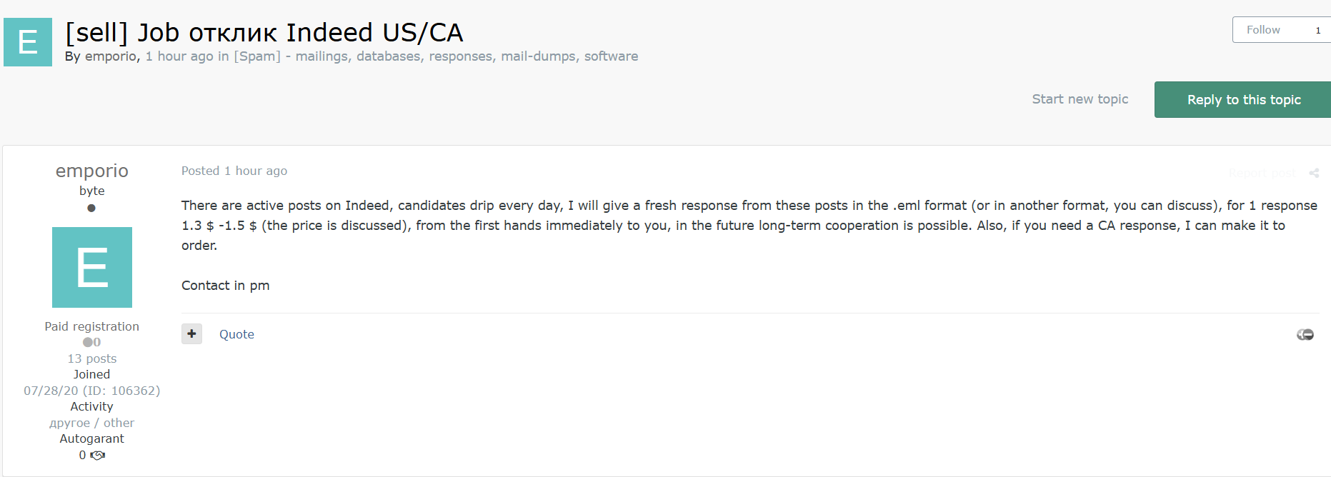 网络威胁行为者声称正在出售来自美国和加拿大的工作申请回复。据报道,这些答复是新的,并以。eml格式(或根据要求提供另一种格式)。
