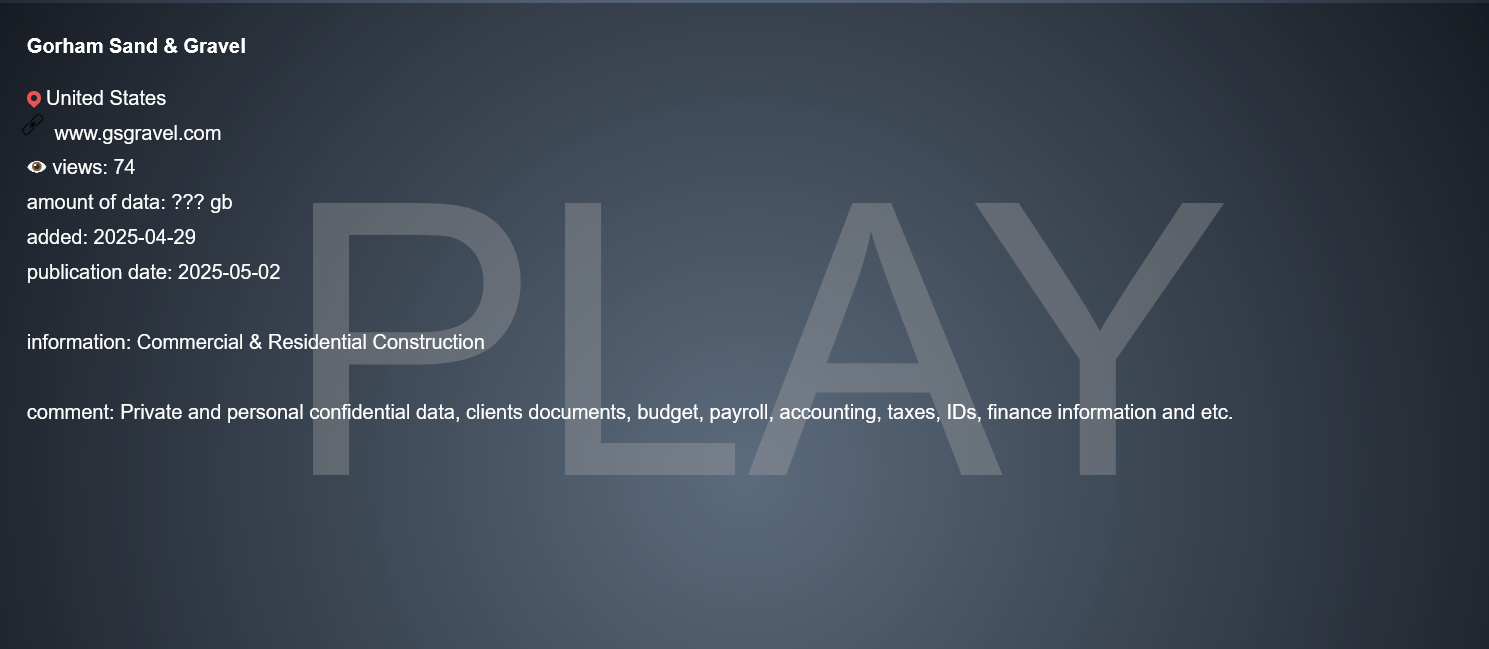 该组织声称已从总部位于美国的商业和住宅建筑公司Gorham Sand&Gravel获得数据,并计划于2025年5月2日发布。受损数据包括私人和个人机密信息、客户文档等such、预算、工资记录、会计文件、税务明细、身份证和各种财务记录。