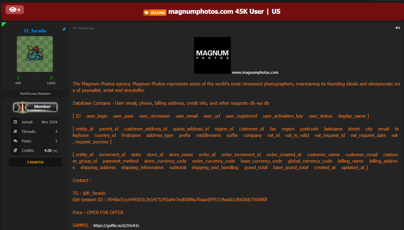 网络威胁行为者声称获得了该组织的数据,其中包括user的电子邮件、电话号码、账单地址和信用卡信息。