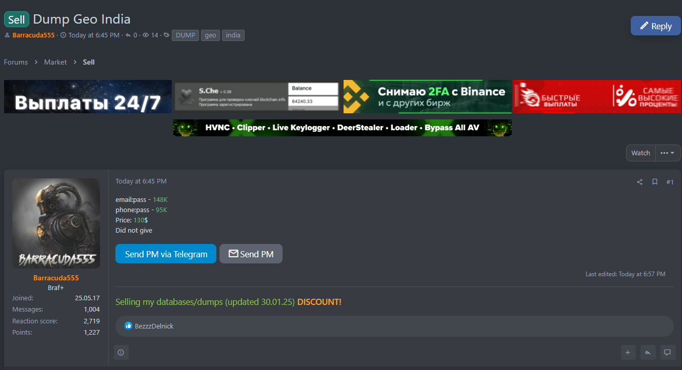 admin7个月前发布关注私信 网络威胁行为者“Barracuda555”声称正在出售一个据称包含印度用户凭据的数据库。据报道,被泄露的数据包括148,000个电子邮件密码对和95,000个电话密码对。 © 版权声明文章版权归作者所有,未经允许请勿转载。THE END威胁情报# 数据泄露# 印度# Barracuda555 喜欢就支持一下吧点赞10 分享QQ空间微博QQ好友海报分享复制链接收藏