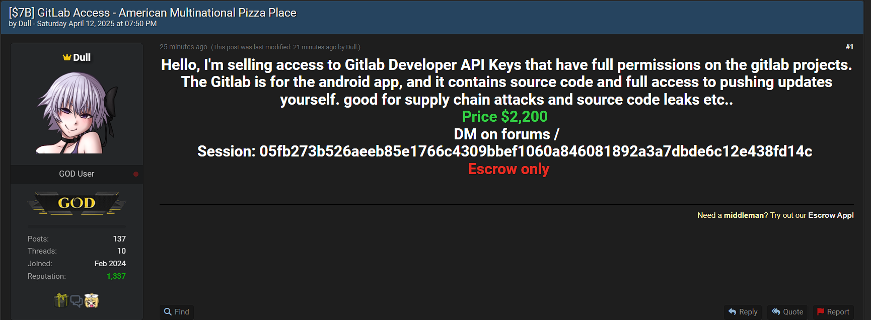 网络威胁行为者声称将未经授权的gitlab开发者API·凯斯出售给一家身份不明的american跨国公司pizza广场。