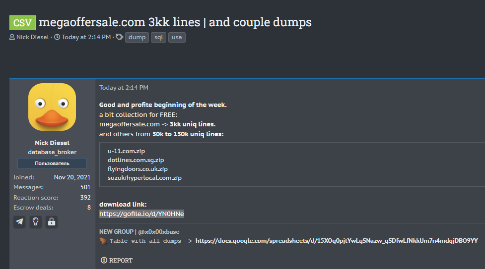 《网络威胁行为者》声称泄露了megaoffersale.com和其他来源的数据。据报道,受损数据包含来自megaoffersale.com的300万条唯一线路以及来自其他来源的50,000至150,000条唯一线路,包括u-11.com、dotlines.com.sg、flyingdoors.co.uk和suzukihyperlocal.com。