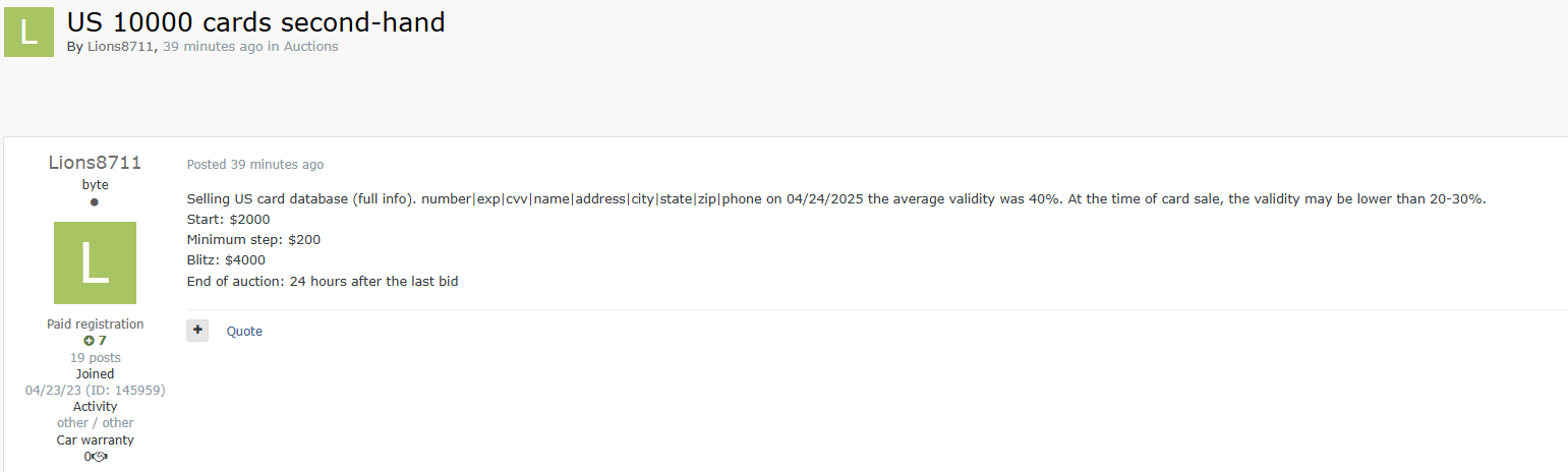 一家网络威胁行为者声称正在出售一个包含美国信用卡详细信息的数据库,包括卡号、到期日期、CVV代码、姓名、地址、cities、州、邮政编码和电话号码。